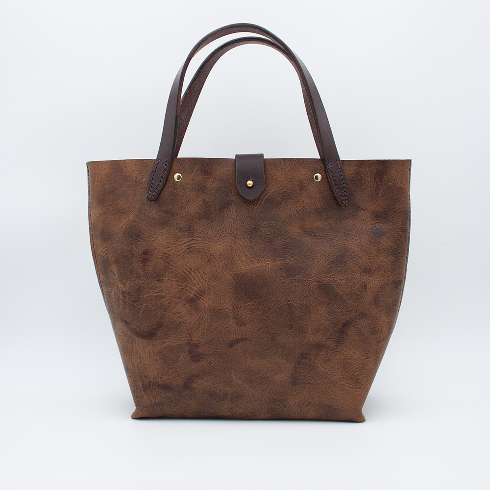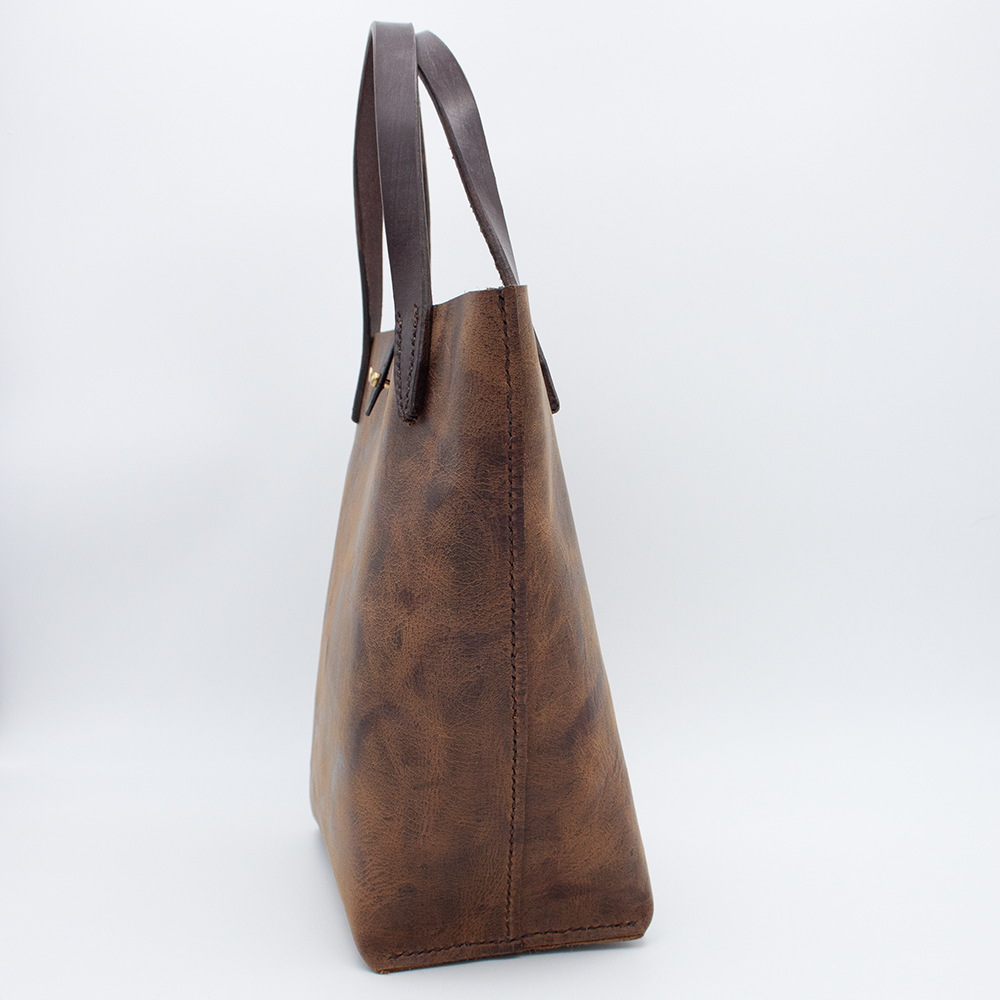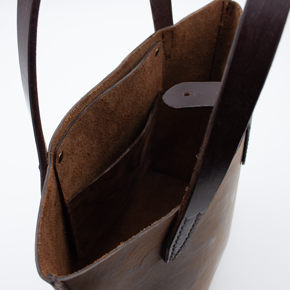 This elegant small tote is crafted from vegetable-tanned shoulder leather, known for its supple texture and natural patina that develops over time. The bag is hand-stitched with durable white waxed thread, ensuring a strong and long-lasting construction.